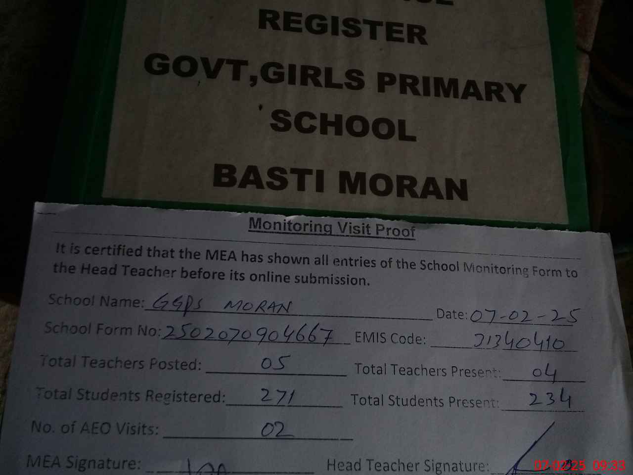| Attendance Register | Head Teacher | MEA with School | Visit Proof |