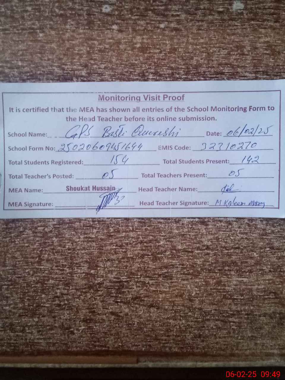 | Attendance Register | Head Teacher | MEA with School | Visit Proof |