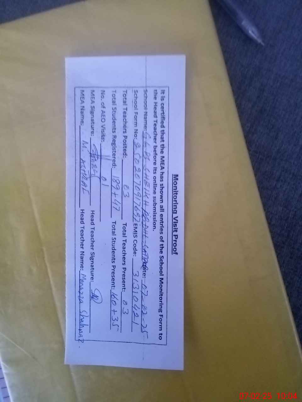 | Attendance Register | Head Teacher | MEA with School | Visit Proof |