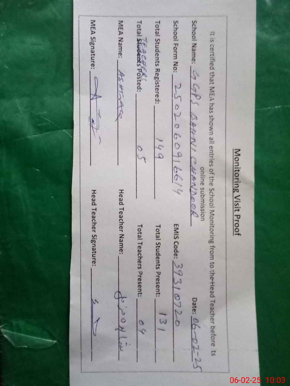 | EMIS Code: 39310720 | Name of School: GGPS BAHNI CHANDOOR | |||