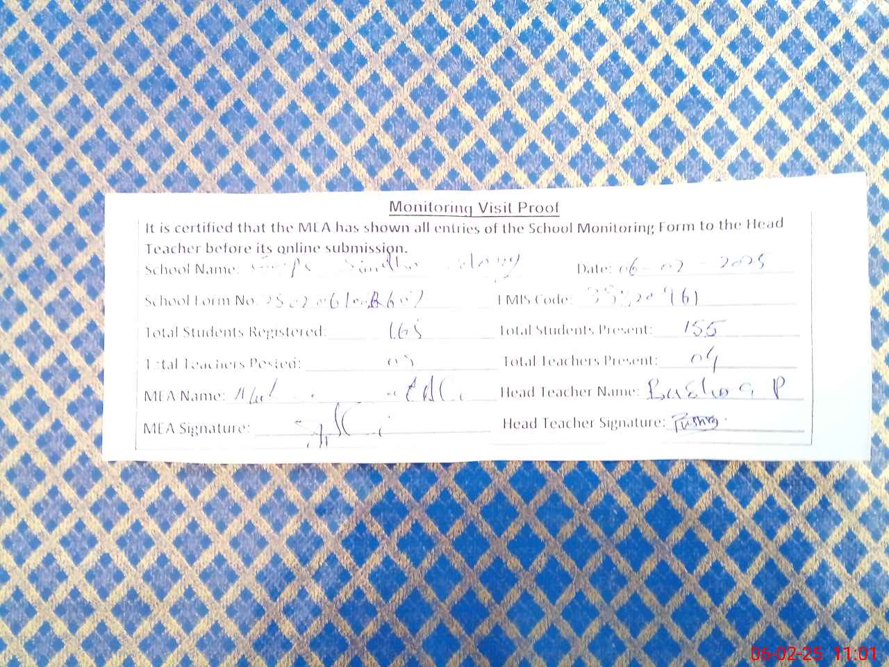| Attendance Register | Head Teacher | MEA with School | Visit Proof |