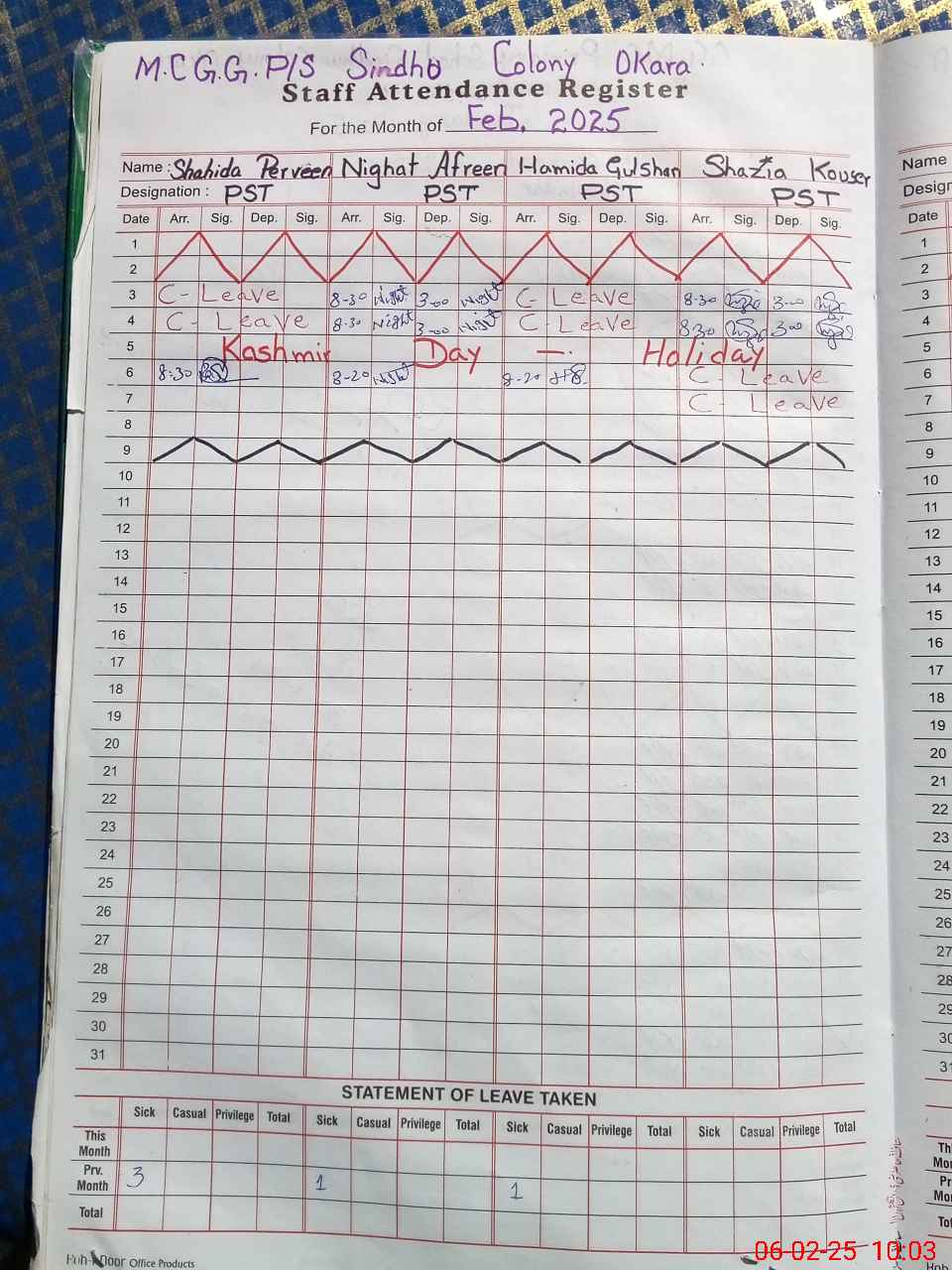 | Leave | Duty | Absent | Maternity | Medical | Ex- Pak |