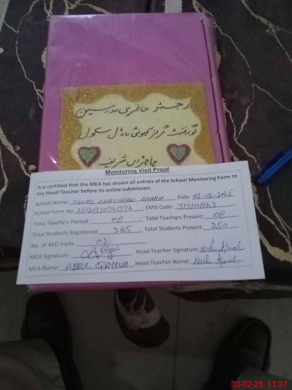 | Attendance Register | Head Teacher | MEA with School | Visit Proof |