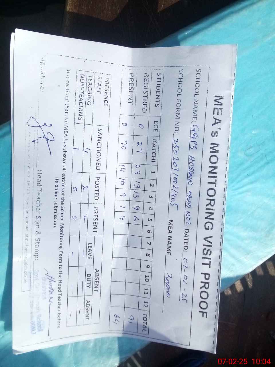 | Attendance Register | Head Teacher | MEA with School | Visit Proof |
