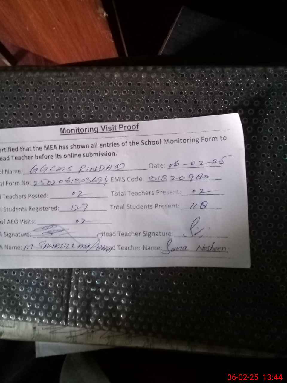 | Attendance Register | Head Teacher | MEA with School | Visit Proof |