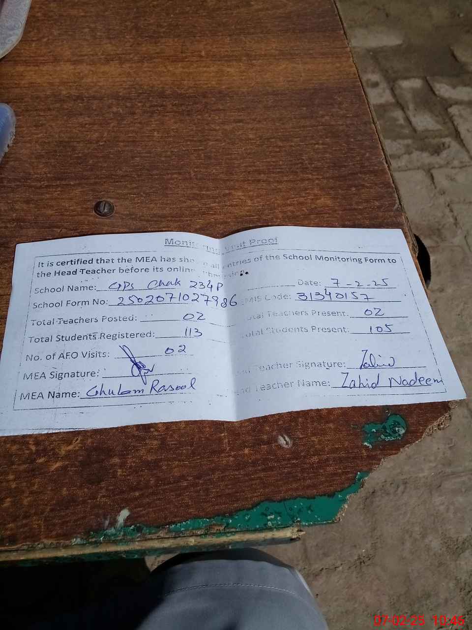 | Attendance Register | Head Teacher | MEA with School | Visit Proof |