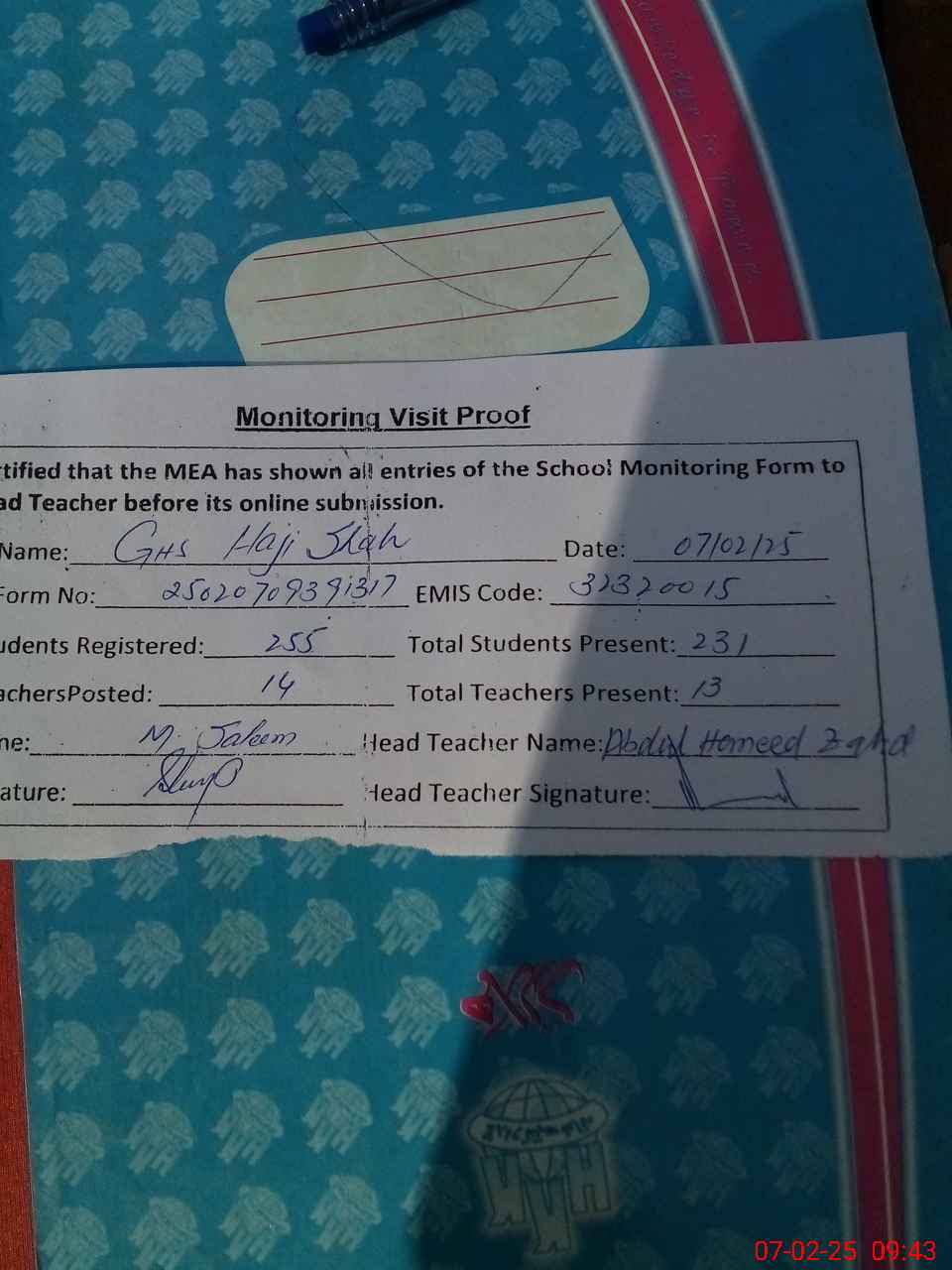 | Attendance Register | Head Teacher | MEA with School | Visit Proof |