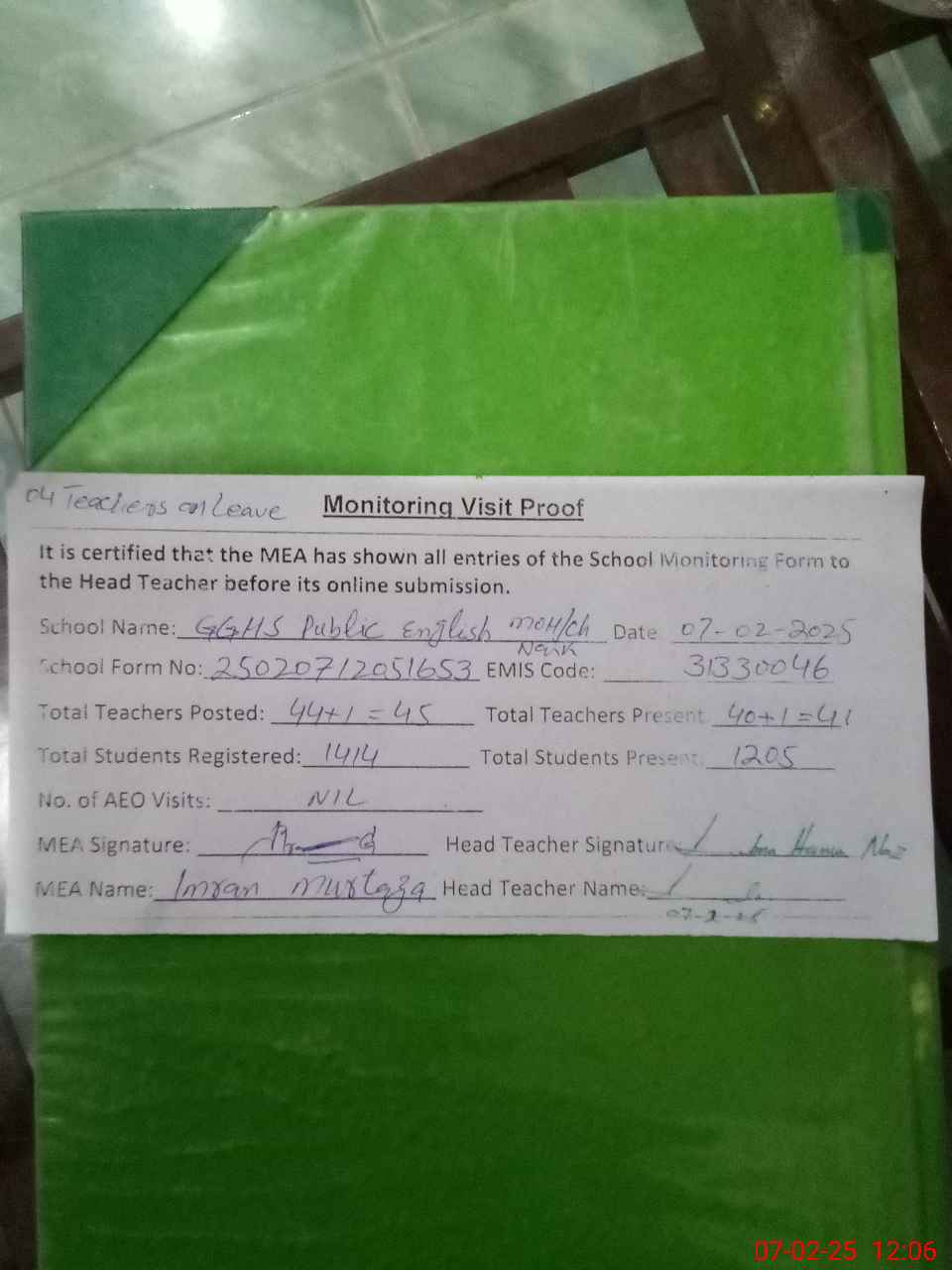 | Attendance Register | Head Teacher | MEA with School | Visit Proof |