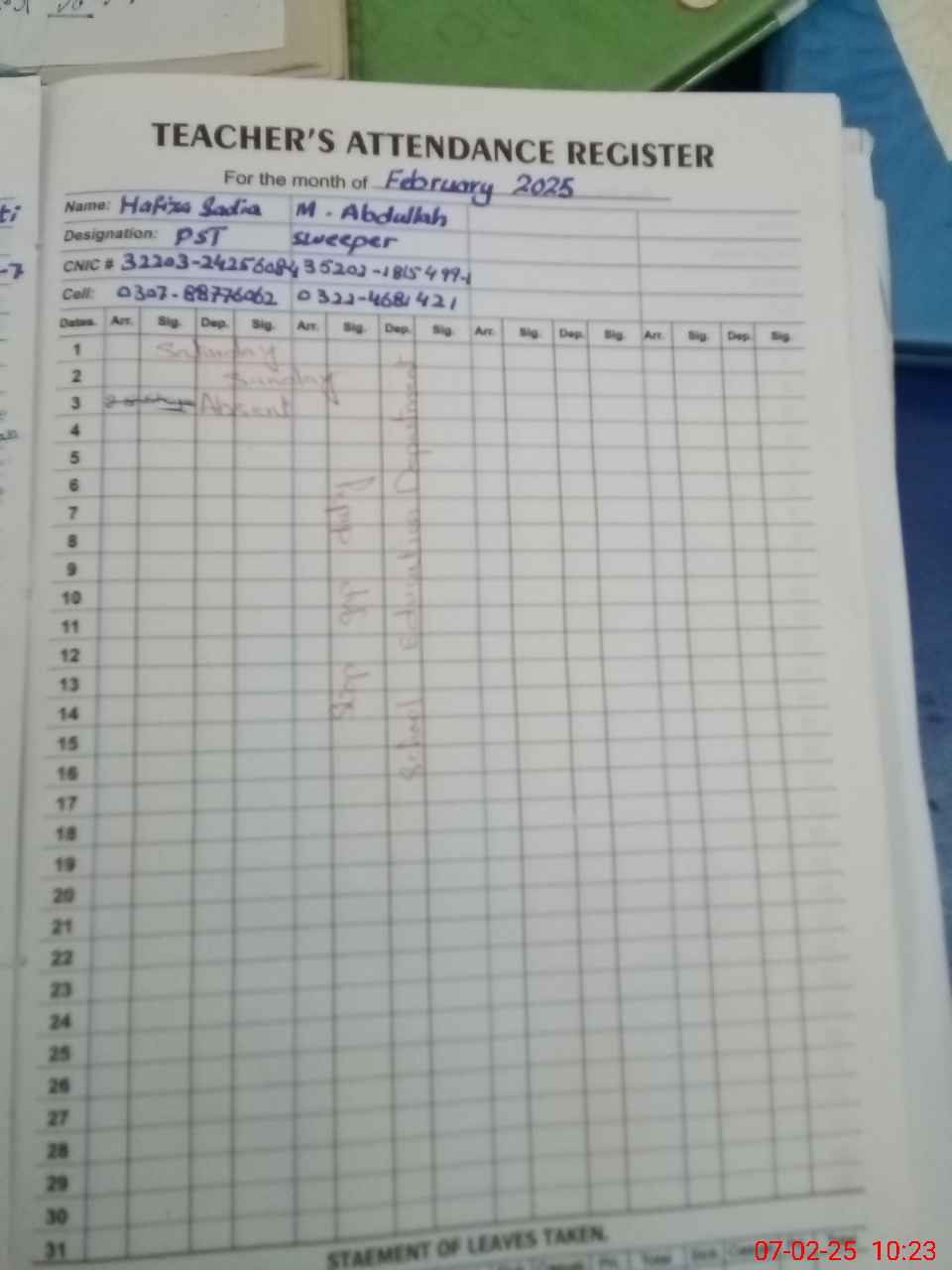 | Remarks (Use Separate Page if Required): Hafiza Sadia Saleem PST absent wef 21 October 2024 to till date Shayan Bhatti SG attach this from GGPS Theh Panjoo 35210637 | |||||