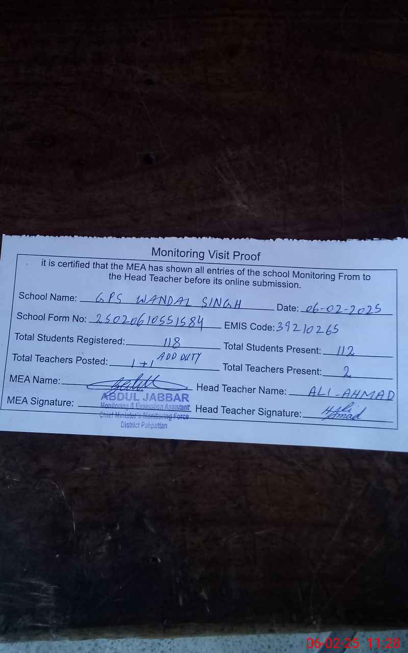 | EMIS Code: 39210265 | Name of School: GPS WANDAL SINGH | |||