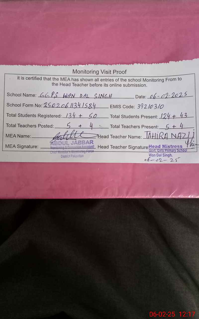 | EMIS Code: 39210310 | Name of School: GGPS WAN DAL SINGH | |||