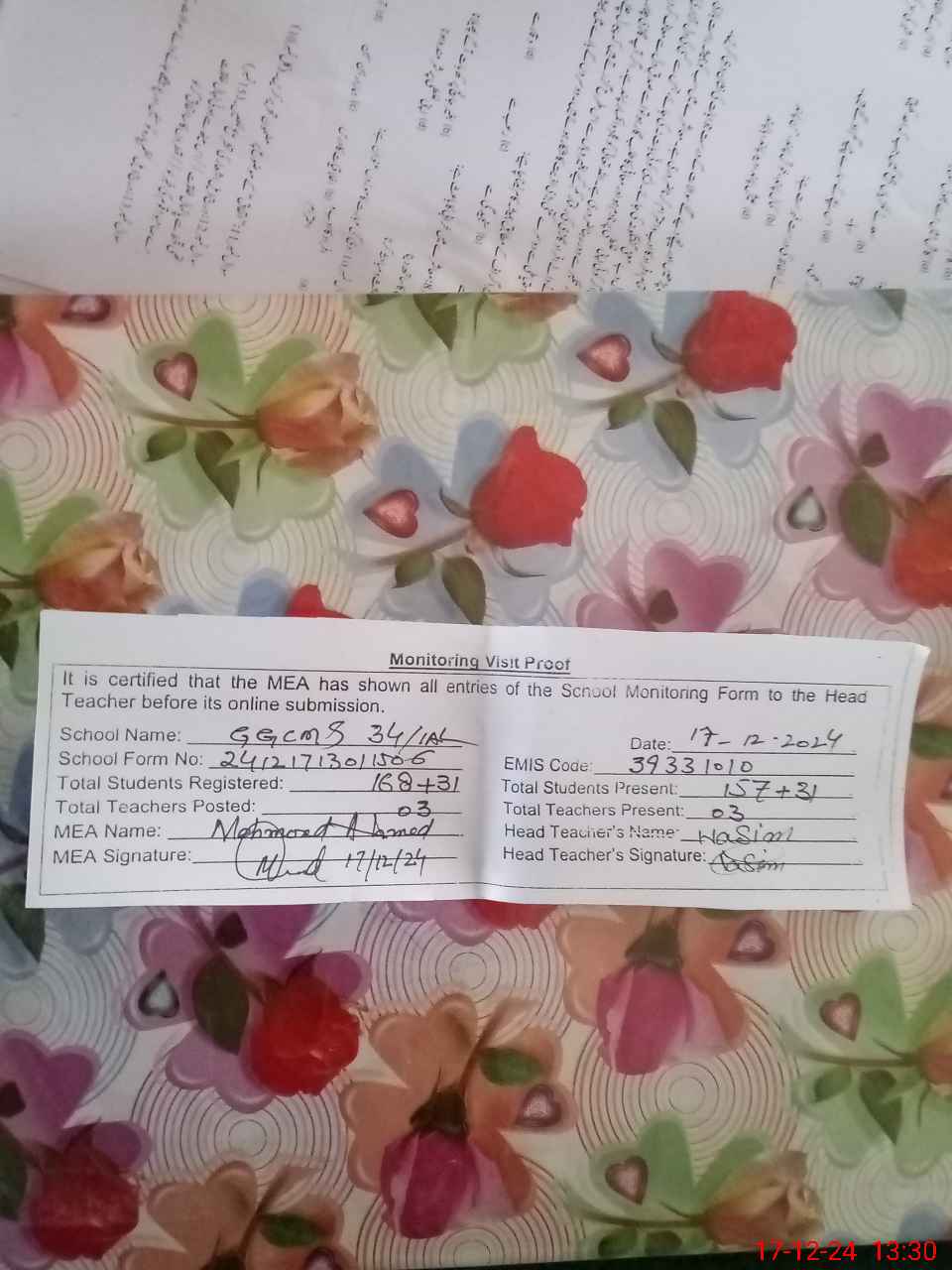 | Attendance Register | Head Teacher | MEA with School | Visit Proof |