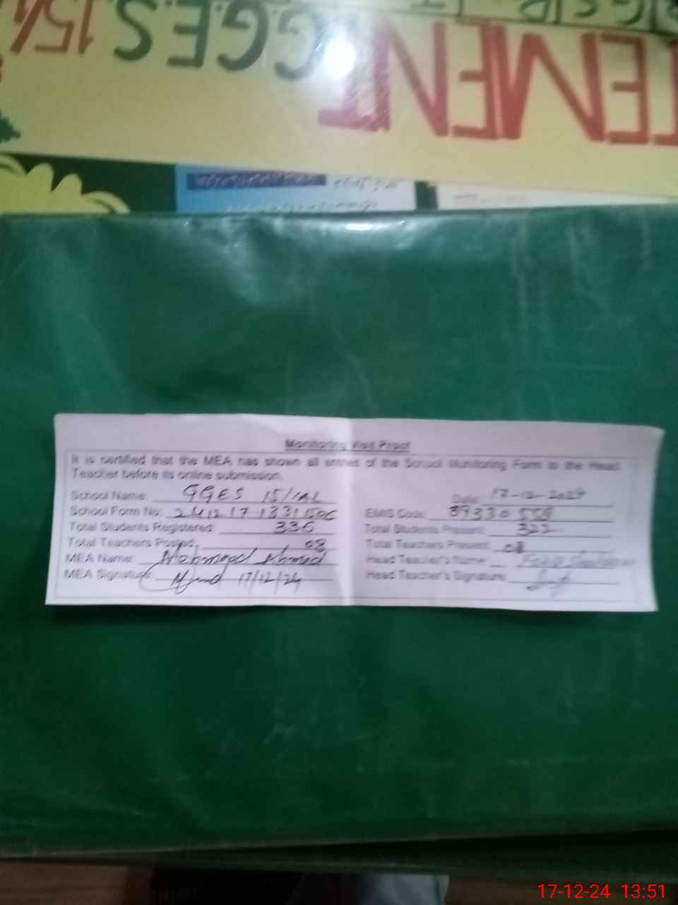 | Attendance Register | Head Teacher | MEA with School | Visit Proof |