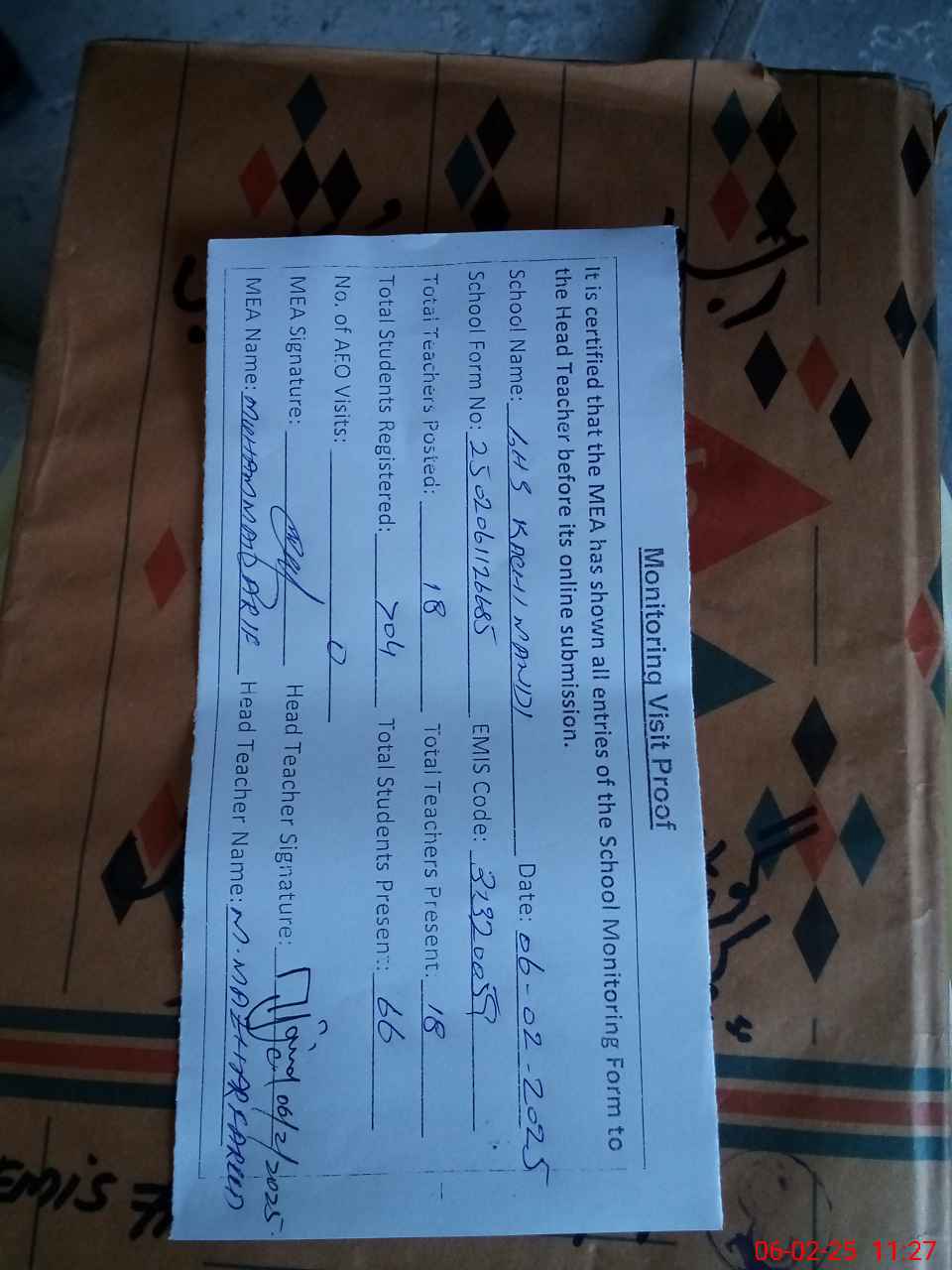 | Attendance Register | Head Teacher | MEA with School | Visit Proof |
