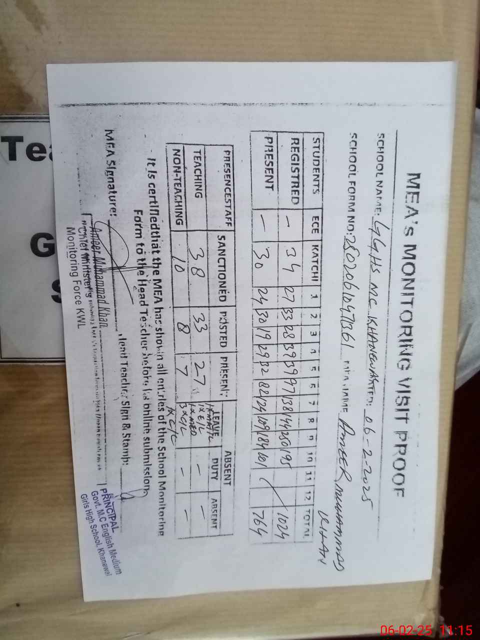 | Attendance Register | Head Teacher | MEA with School | Visit Proof |