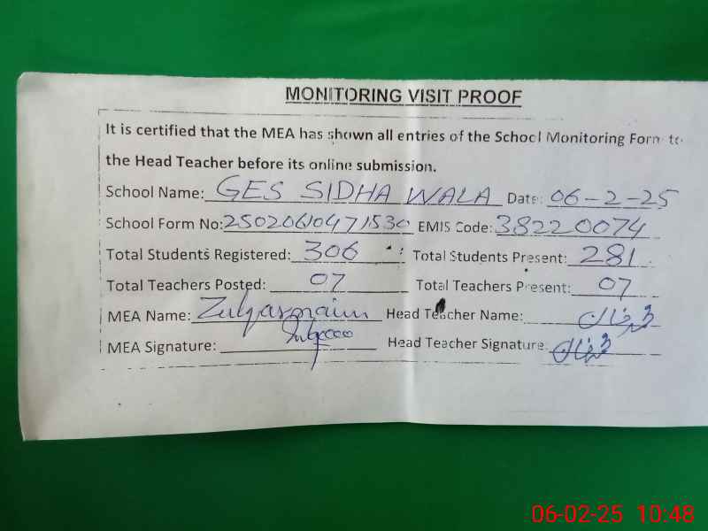| EMIS Code: 38220074 | Name of School: GES SIDHA WALA | |||