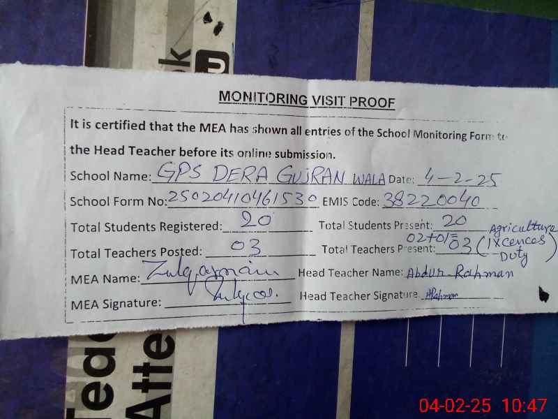 | EMIS Code: 38220040 | Name of School: GPS DERA GUJRAN WALA | |||