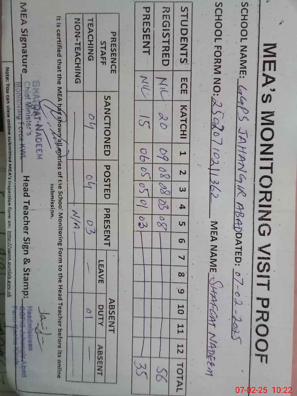 | Attendance Register | Head Teacher | MEA with School | Visit Proof |