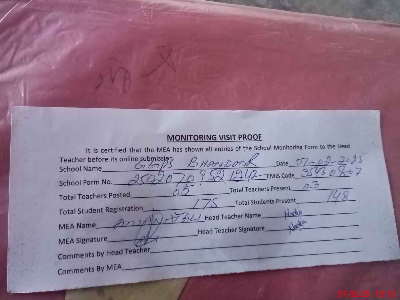 | Attendance Register | Head Teacher | MEA with School | Visit Proof |