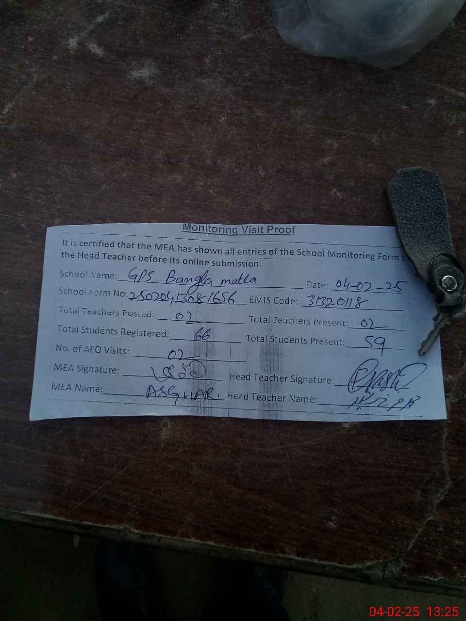 | Attendance Register | Head Teacher | MEA with School | Visit Proof |