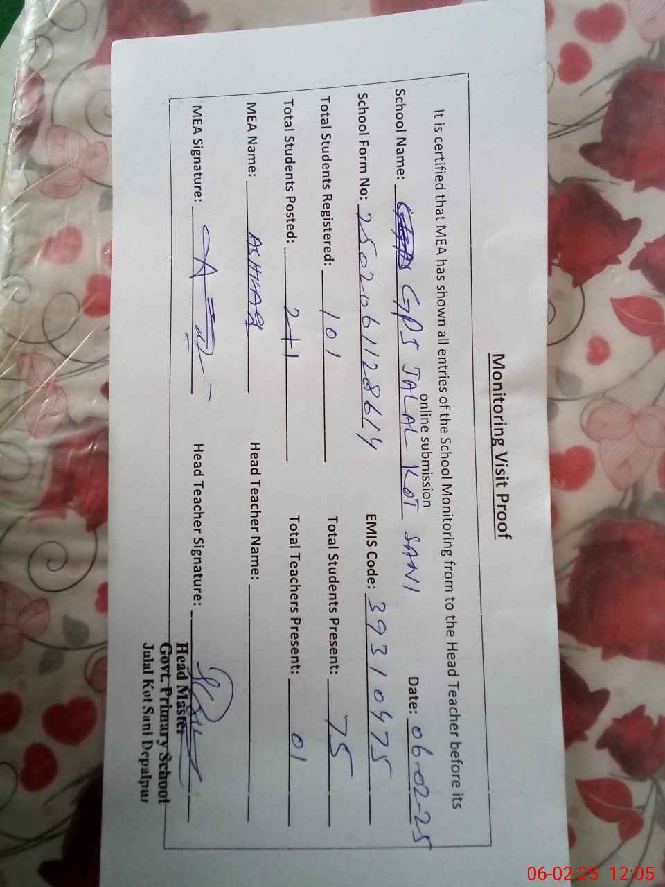 | EMIS Code: 39310475 | Name of School: GPS JALAL KOT SANI | |||