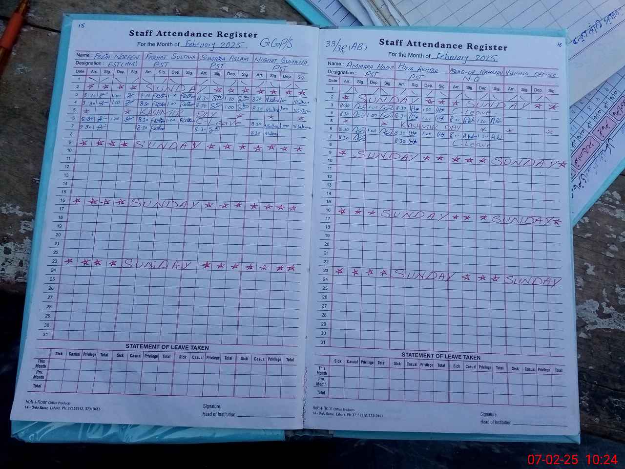 | CNIC | Full Name | Designation | R/C | Absence During Last Calender Month |