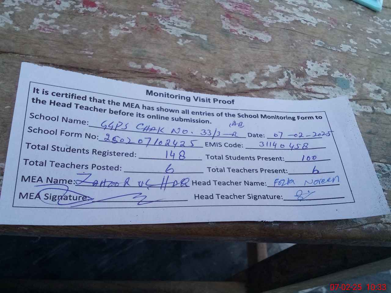 | Attendance Register | Head Teacher | MEA with School | Visit Proof |