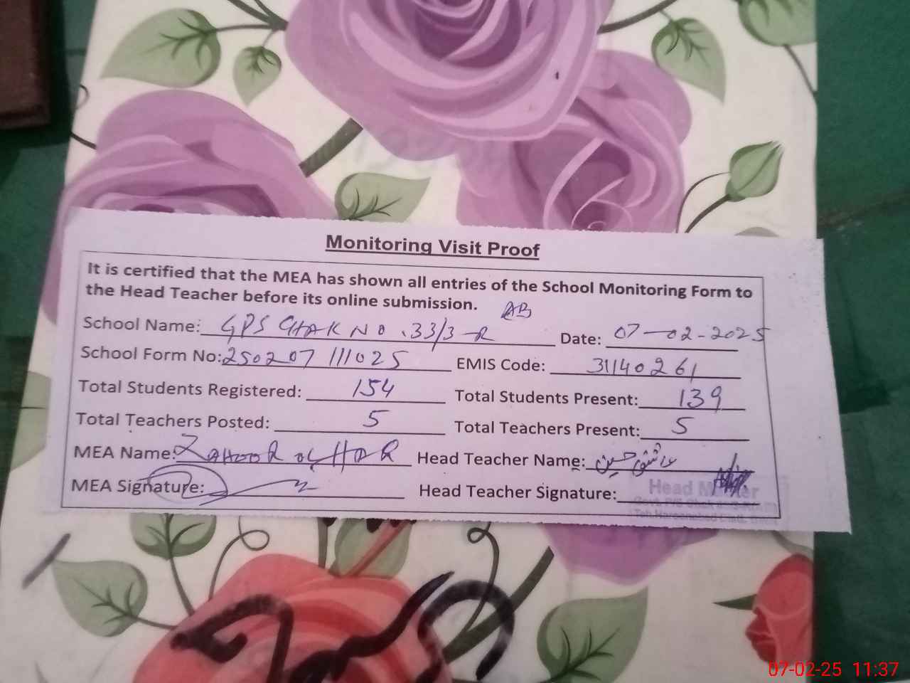 | Attendance Register | Head Teacher | MEA with School | Visit Proof |