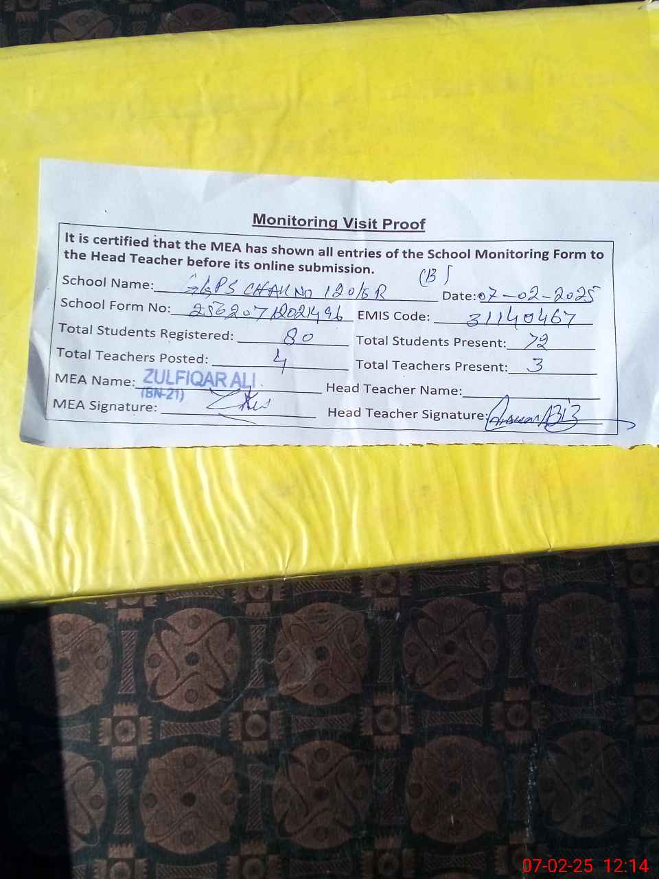 | Attendance Register | Head Teacher | MEA with School | Visit Proof |