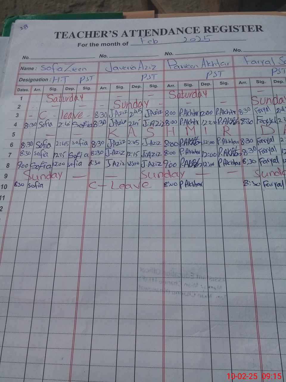 | CNIC | Full Name | Designation | R/C | Absence During Last Calender Month |