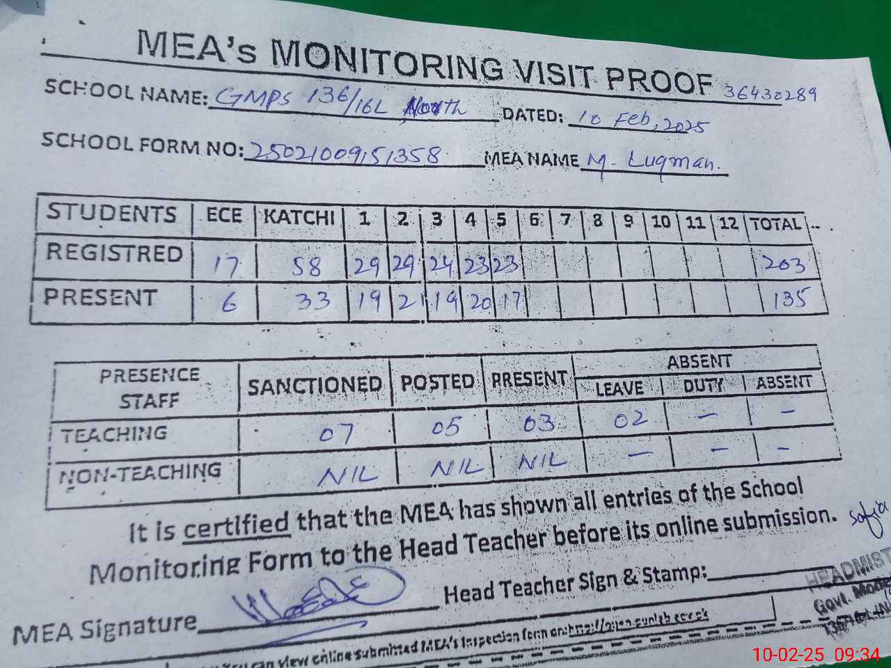 | Attendance Register | Head Teacher | MEA with School | Visit Proof |
