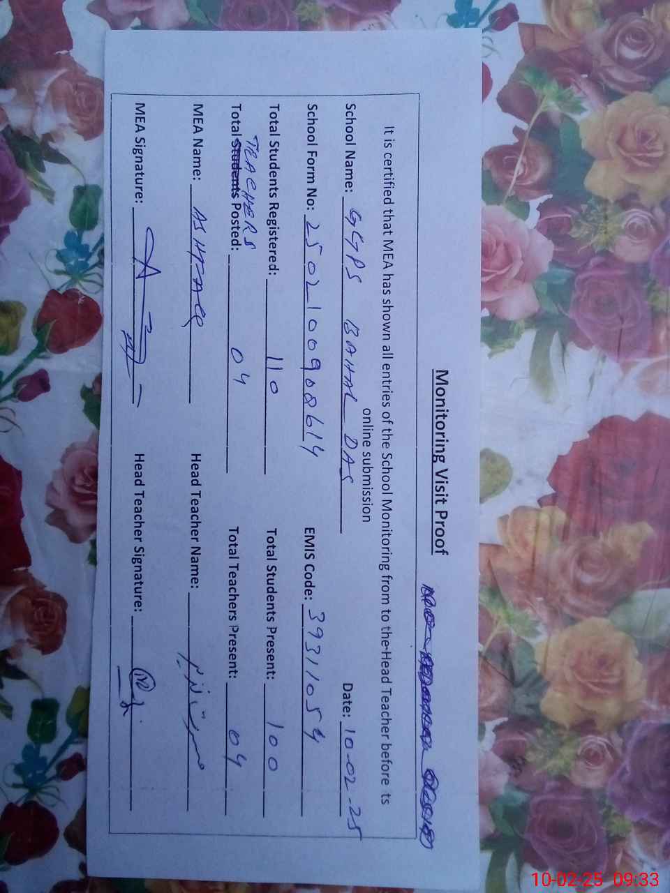 | Attendance Register | Head Teacher | MEA with School | Visit Proof |