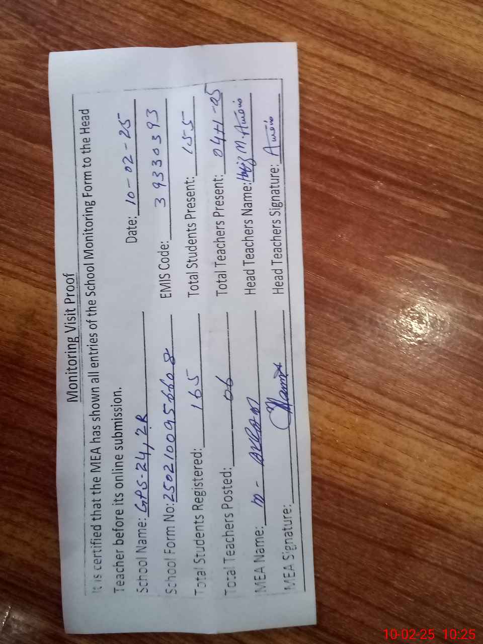 | Attendance Register | Head Teacher | MEA with School | Visit Proof |