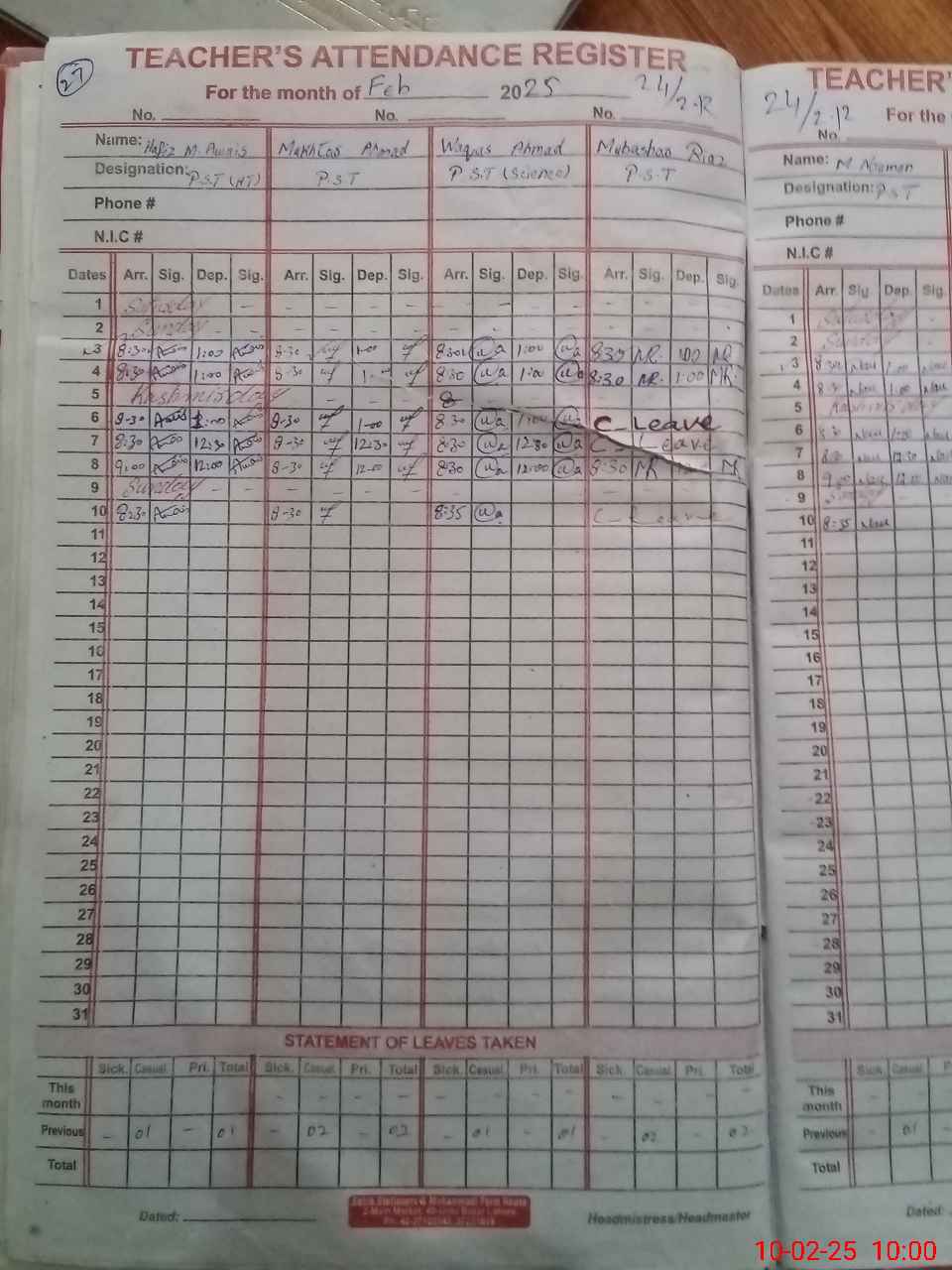| CNIC | Full Name | Designation | R/C | Absence During Last Calender Month |