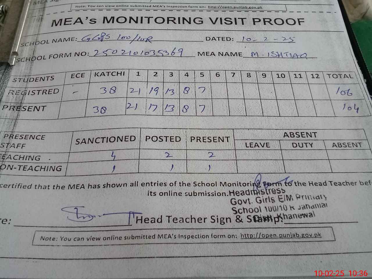 | EMIS Code: 36440507 | Name of School: GGPS 100-10/R, JAHANIAN | |||