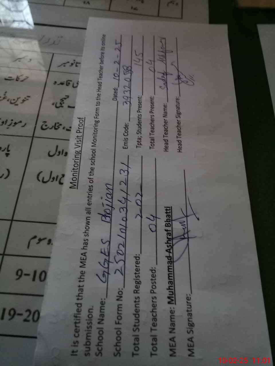 | Attendance Register | Head Teacher | MEA with School | Visit Proof |