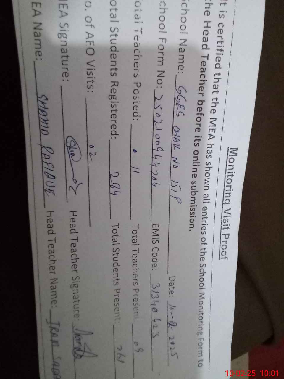 | Attendance Register | Head Teacher | MEA with School | Visit Proof |