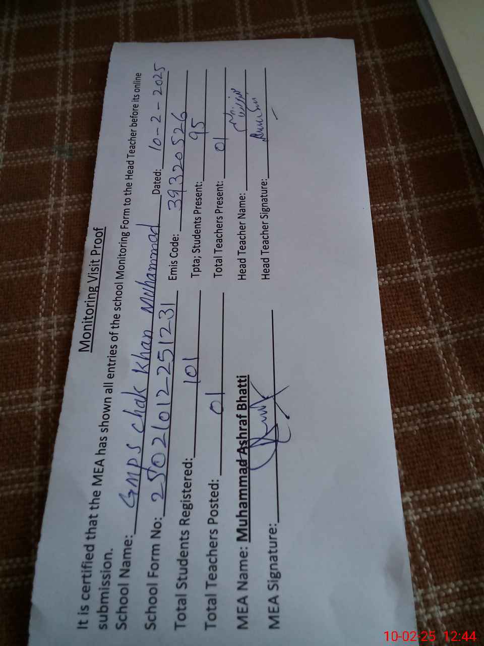 | Certified that this School was Inspected by the Undersigned MEA/DMO Today and the Information Stated Above is as Per Record. | |||||