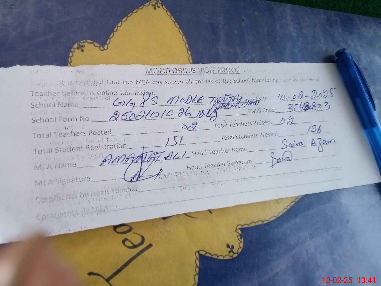 | Attendance Register | Head Teacher | MEA with School | Visit Proof |