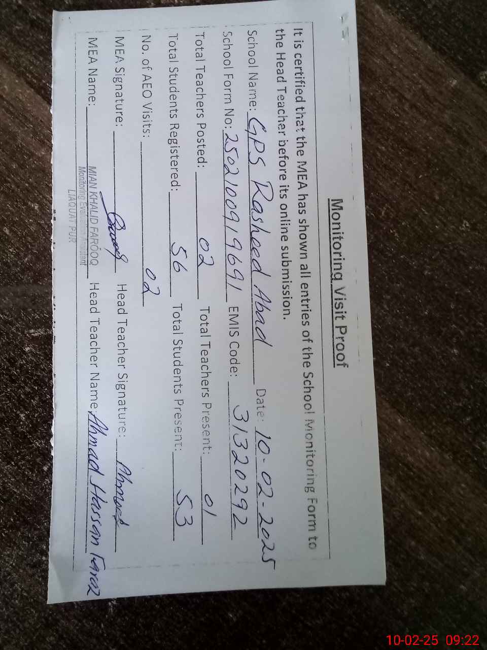 | EMIS Code: 31320292 | Name of School: GPS RASHEED ABAD | |||