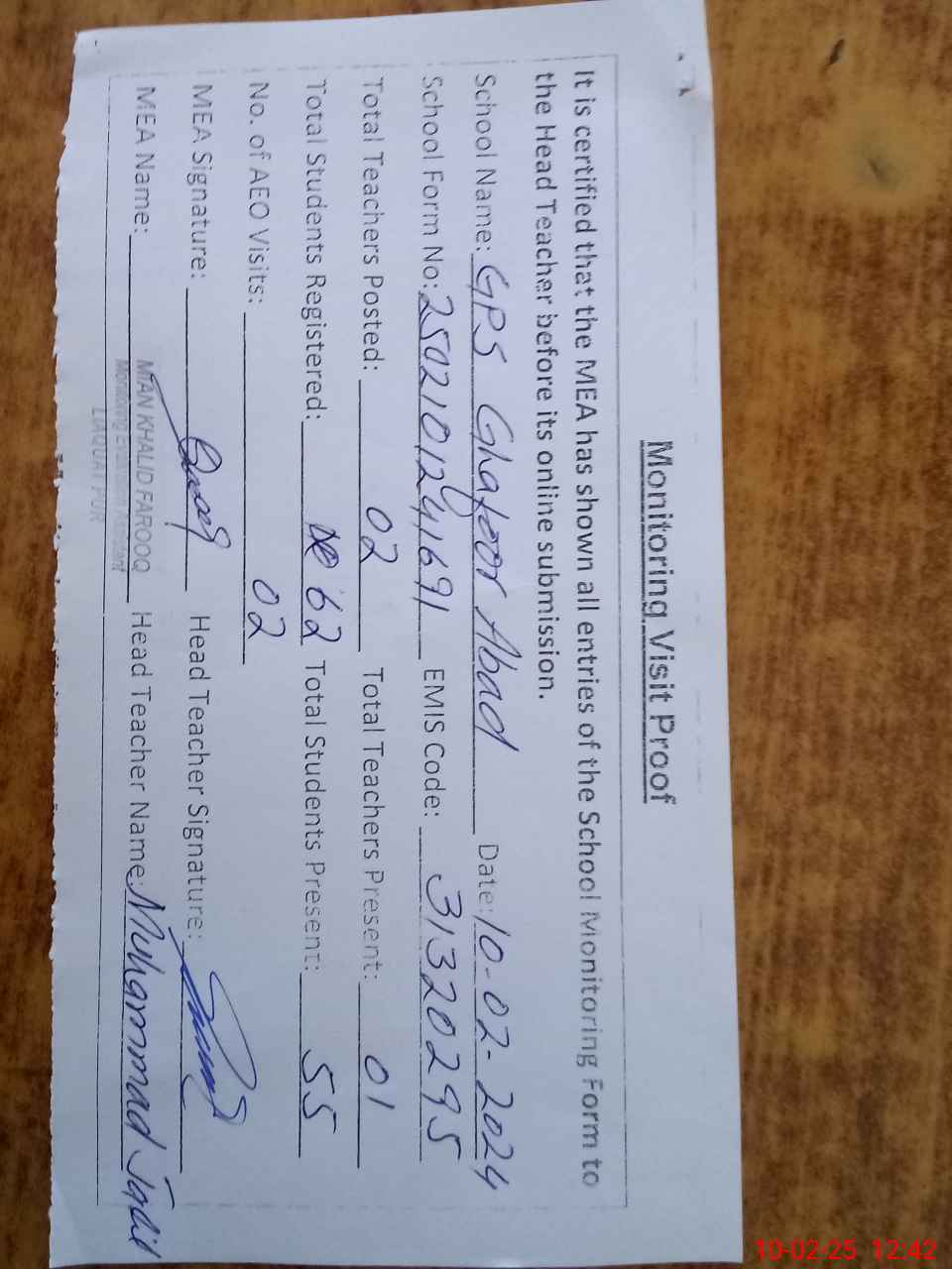 | Attendance Register | Head Teacher | MEA with School | Visit Proof |