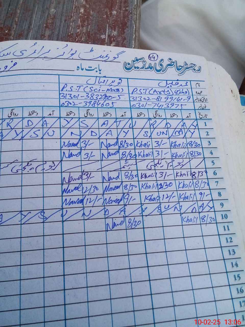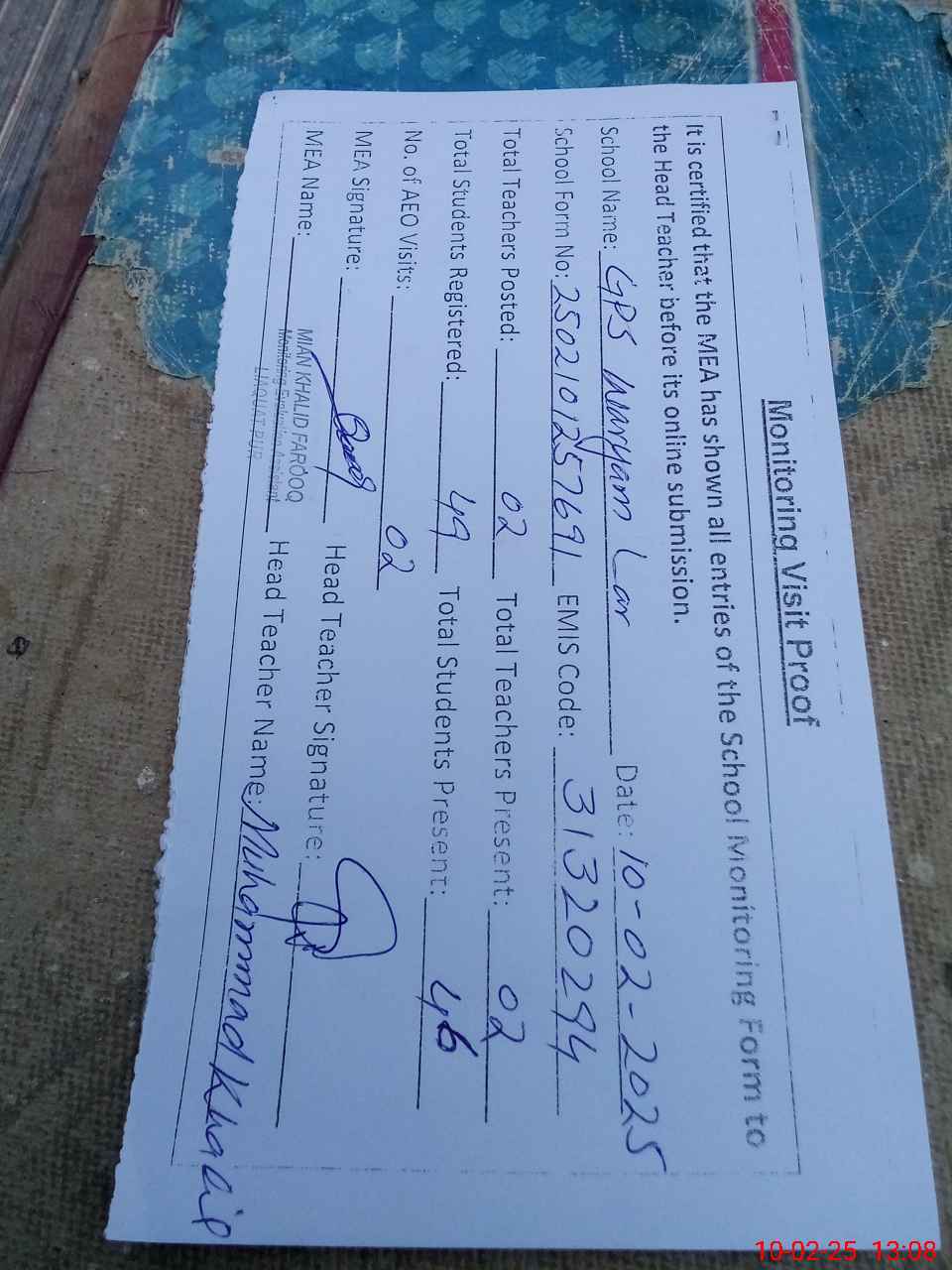 | Name: MU**** KH**** Designation: (School Headmaster's/Headmistress's) PST/PTC/JV Phone/Cell Number: 03**** |