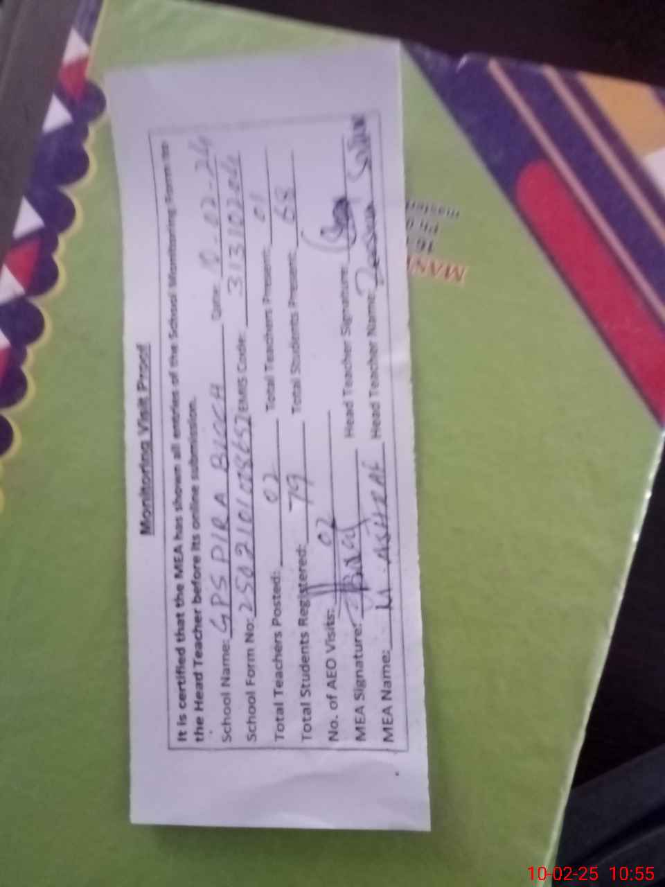 | Attendance Register | Head Teacher | MEA with School | Visit Proof |