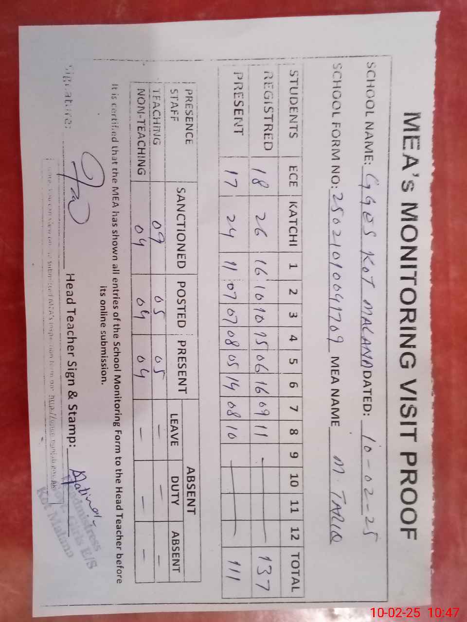 | Attendance Register | Head Teacher | MEA with School | Visit Proof |