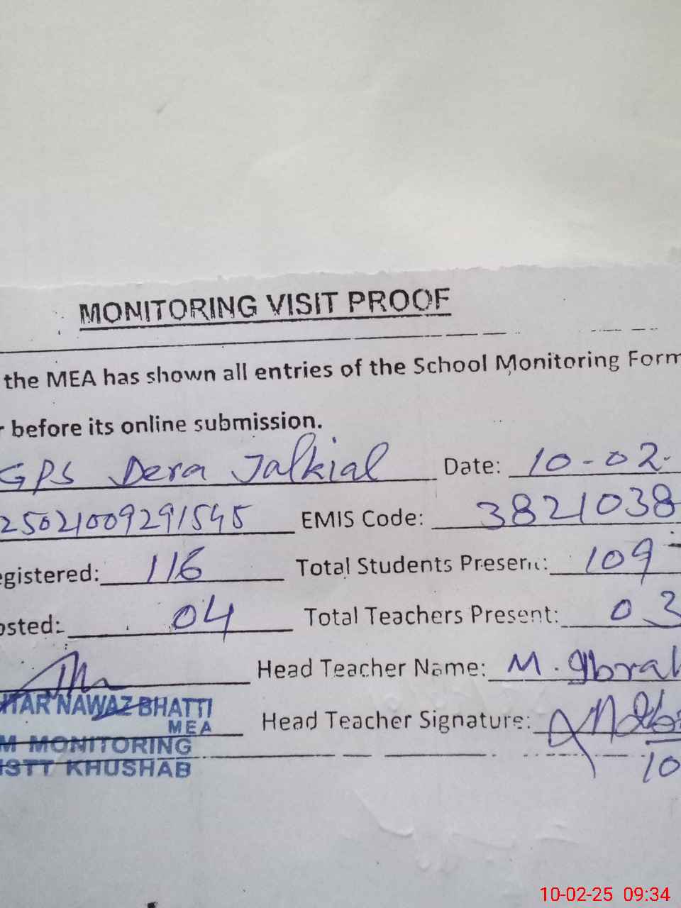 | Attendance Register | Head Teacher | MEA with School | Visit Proof |