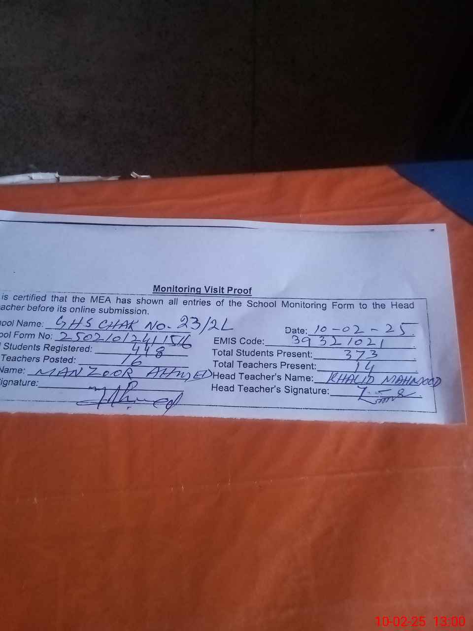 | Attendance Register | Head Teacher | MEA with School | Visit Proof |