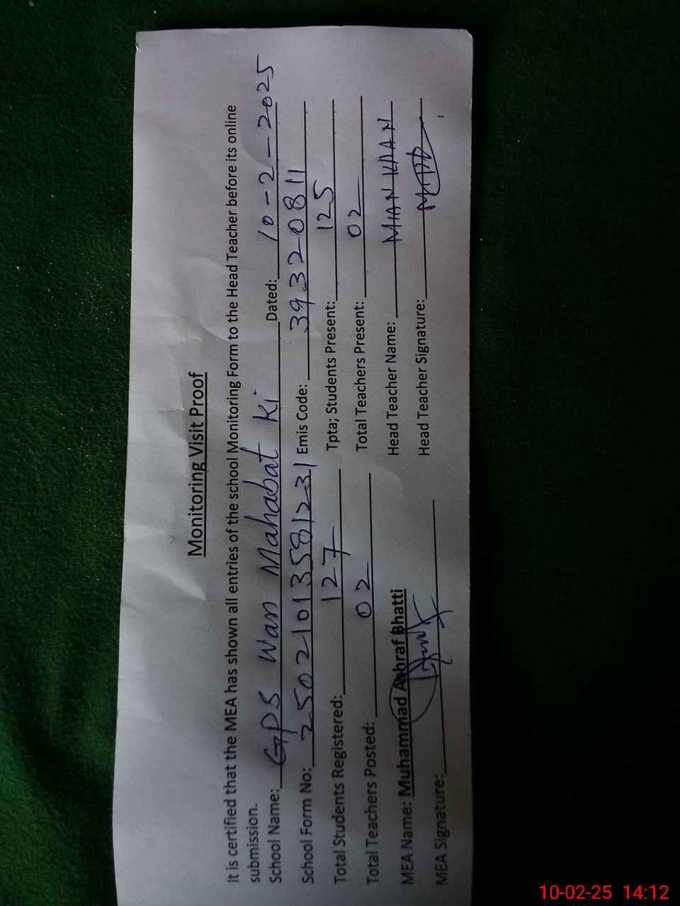 | EMIS Code: 39320811 | Name of School: GPS WAN MAHABAT KI | |||