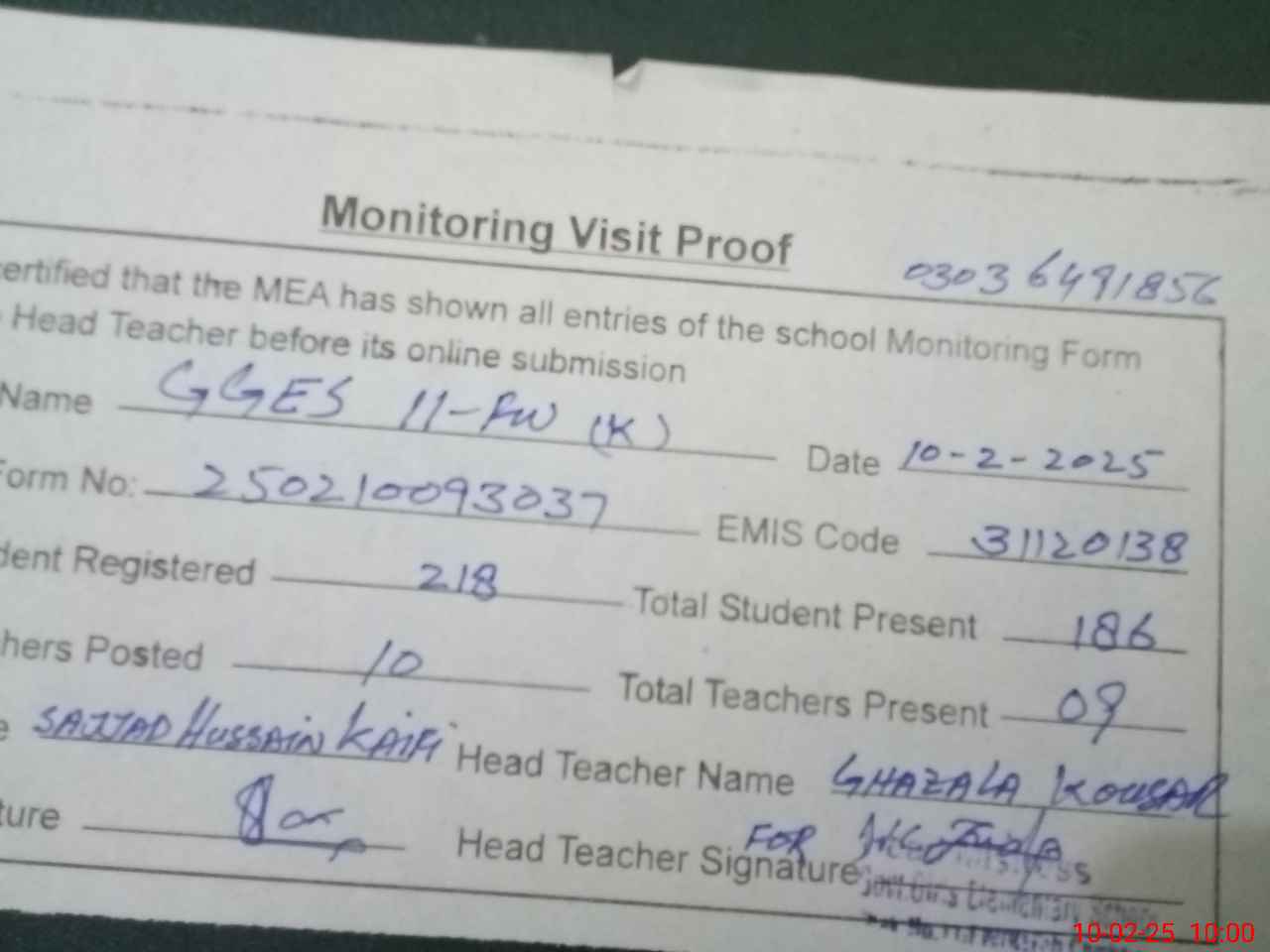 | Name: GH**** KO**** Designation: (School Headmaster's/Headmistress's) S.S.T.(General) Phone/Cell Number: 03**** |