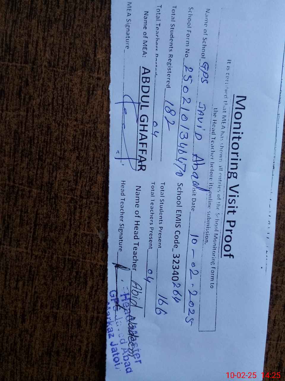 | EMIS Code: 32340264 | Name of School: GPS S JAVAID ABAD | |||