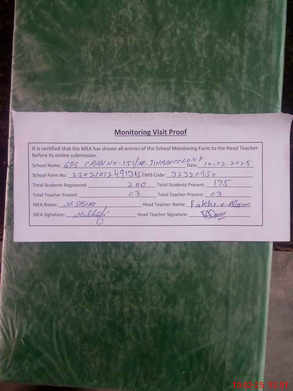 | Certified that this School was Inspected by the Undersigned MEA/DMO Today and the Information Stated Above is as Per Record. | |||||